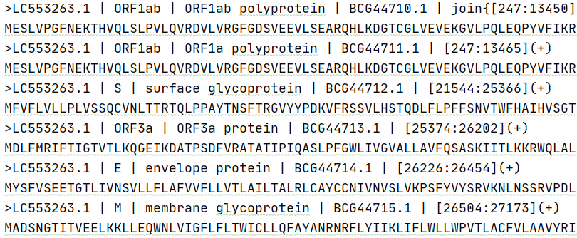 gb_file = f"res/genbank/SARS-CoV-2.gb" fasta_file = f"out/output_s_m_orf10.fasta" baimoTools = BaimoTools(gb_file, fasta_file) baimoTools.extract_cds(['S', 'M', 'ORF10'])